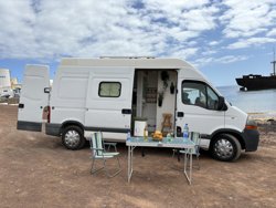 Es una Renault master muy cómoda en la conducción y manejable , consta de un baño con plato de ducha separado , TV ,ducha exterior ,barbacoa ,mesa y sillas , instalación a 12v varios enchufes para poder cargar móviles etc ,tanque de agua limpia 120 litros tanque de agua sucia sobre 75 litros una cama de 1,80x 1,30. Ideal para unas vacaciones en pareja, muy luminosa y coqueta.